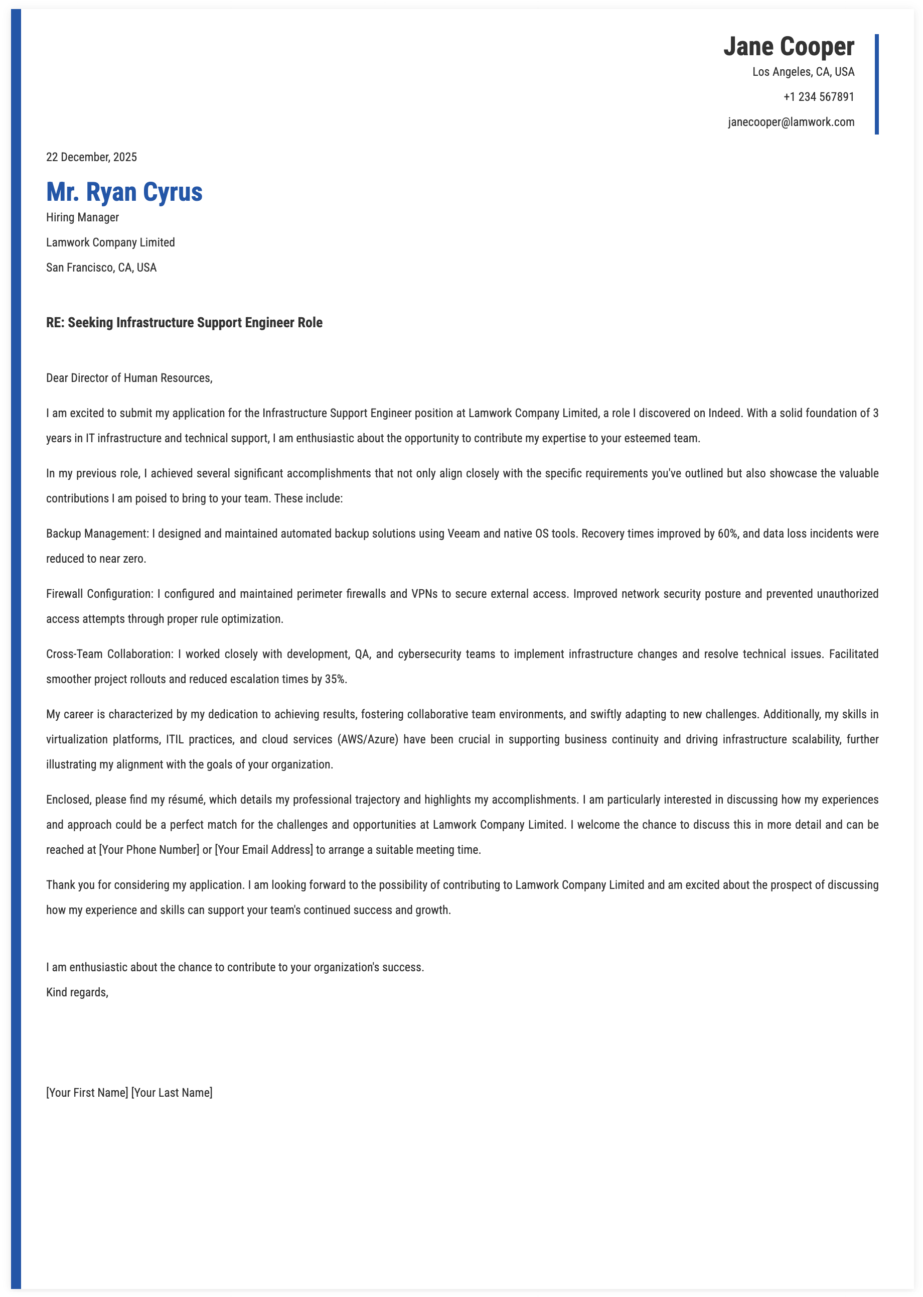What Are the Qualifications and Requirements for Infrastructure Support Engineer in a Cover Letter?