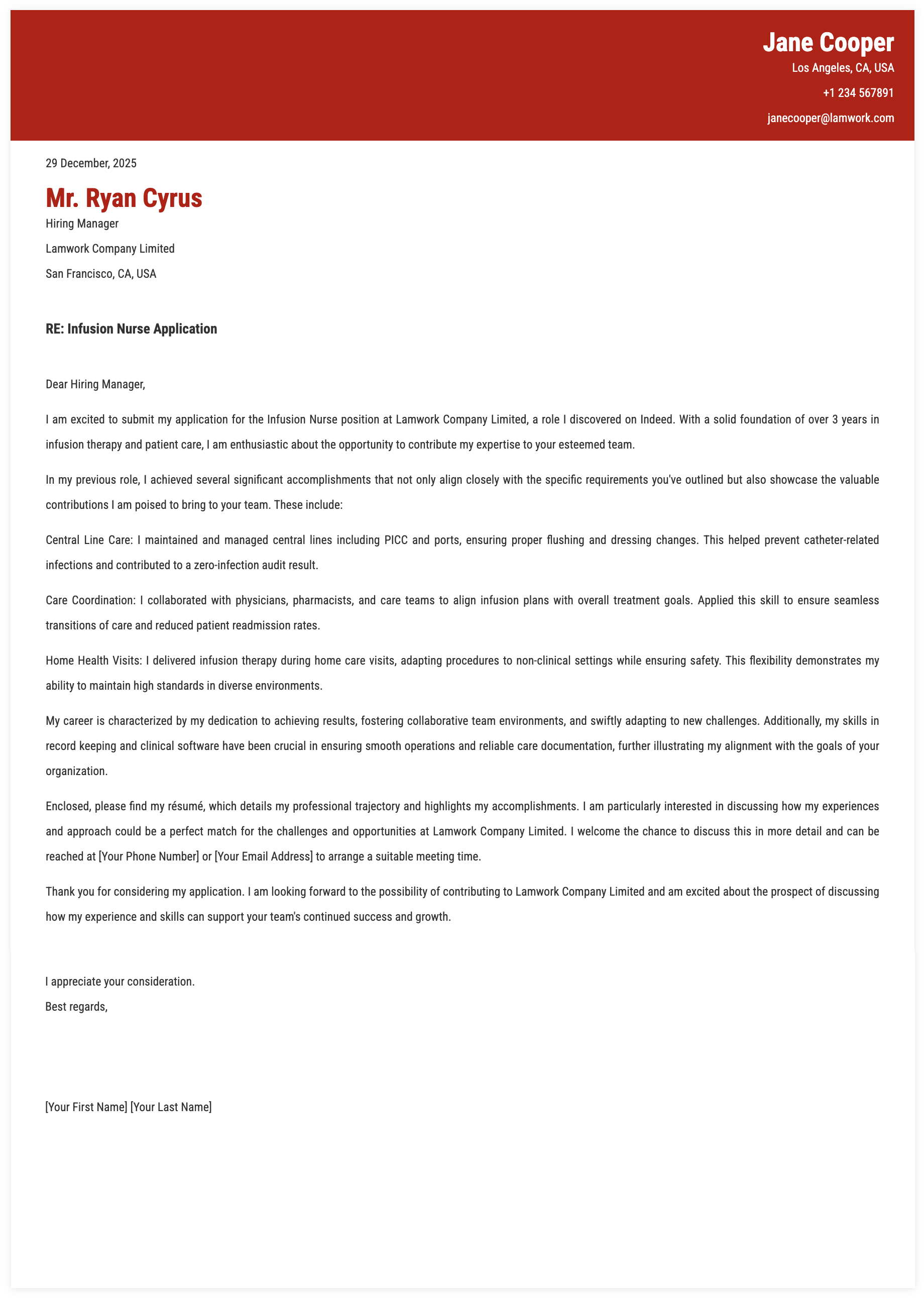 What Are the Qualifications and Requirements for Infusion Nurse in a Cover Letter?