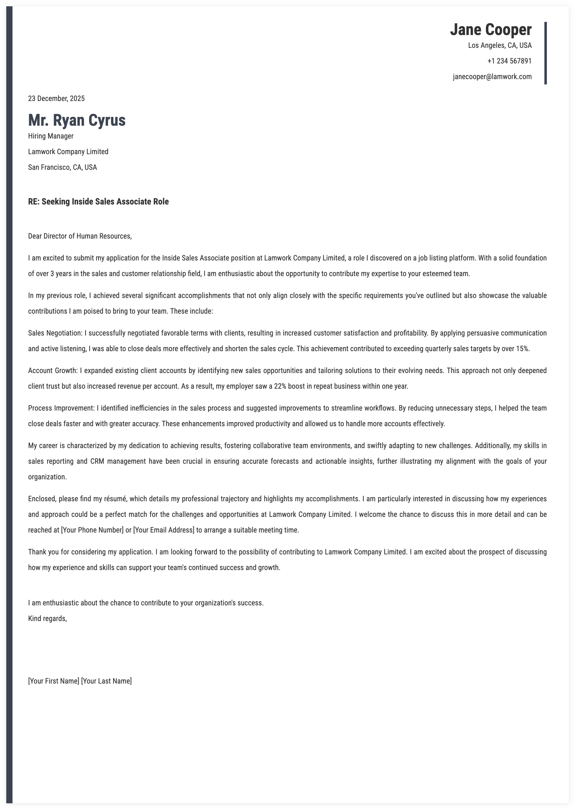 1. Details for Inside Sales Associate Cover Letter