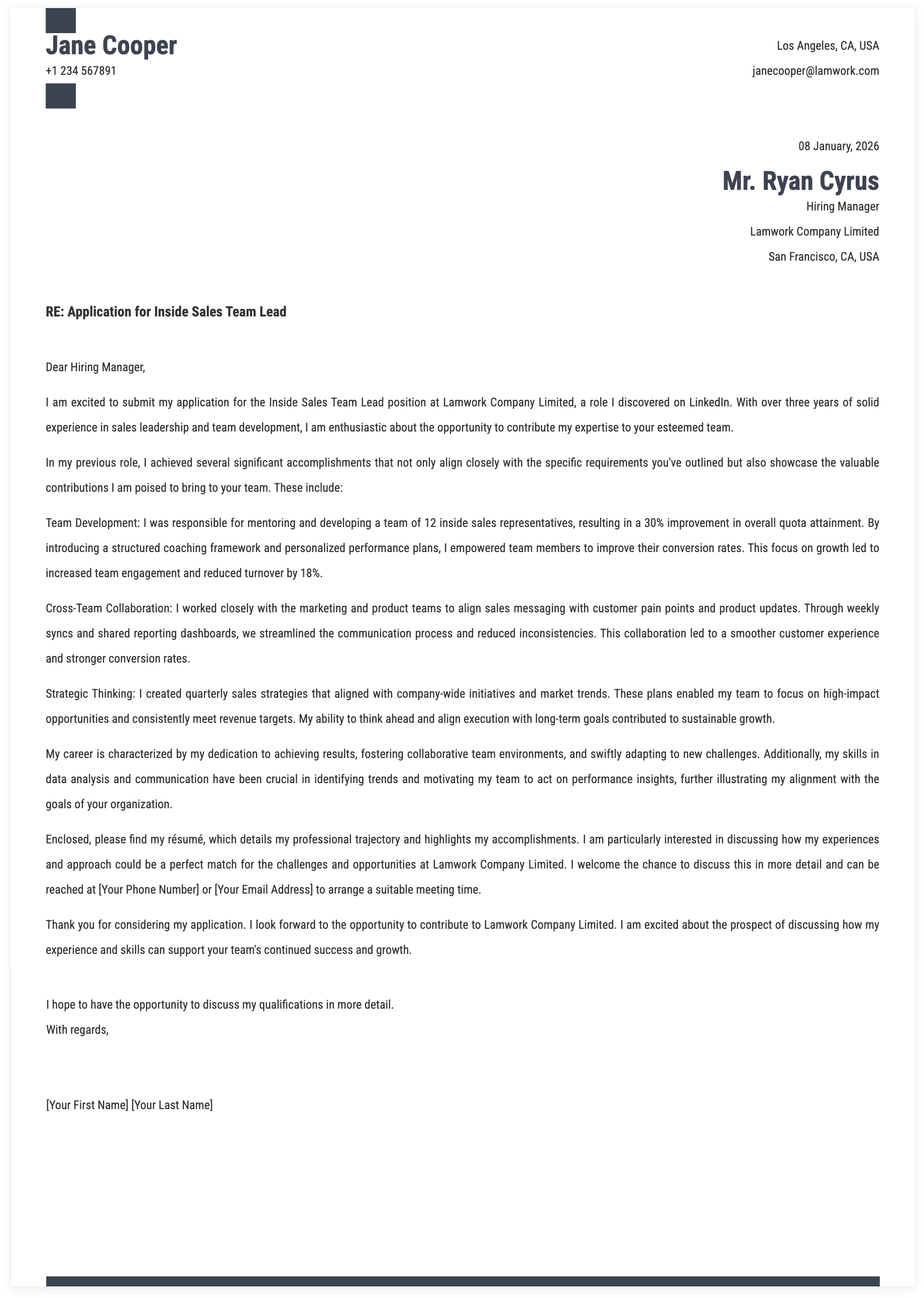 1. Details for Inside Sales Team Lead Cover Letter