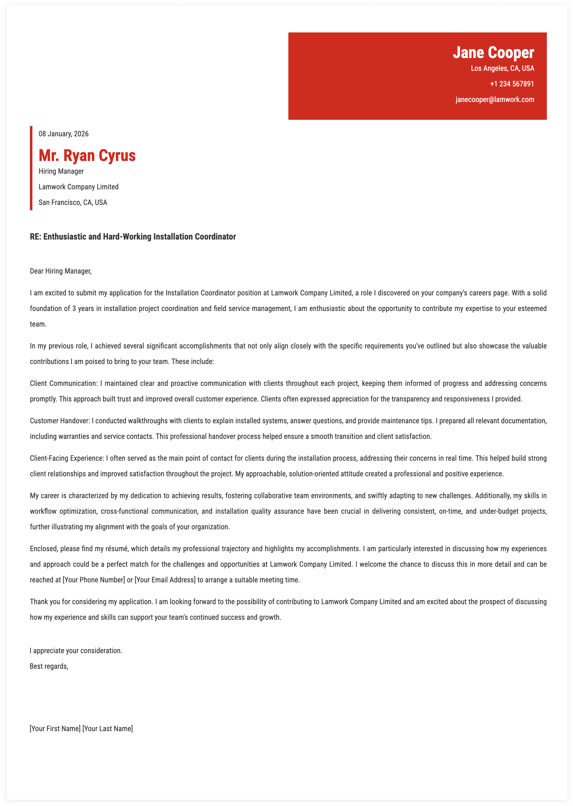 2. Details for Installation Coordinator Cover Letter