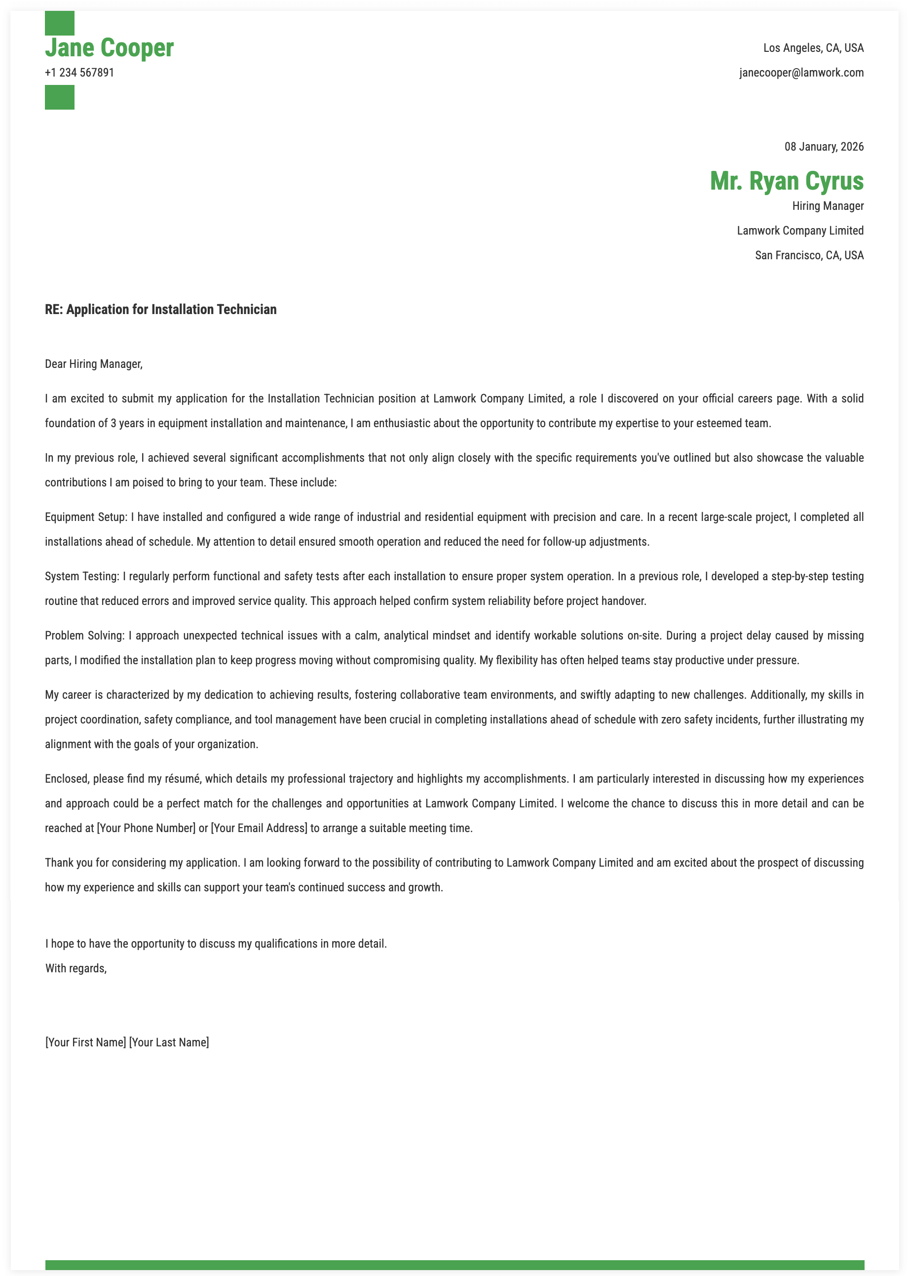 INSTALLATION TECHNICIAN COVER LETTER TEMPLATE