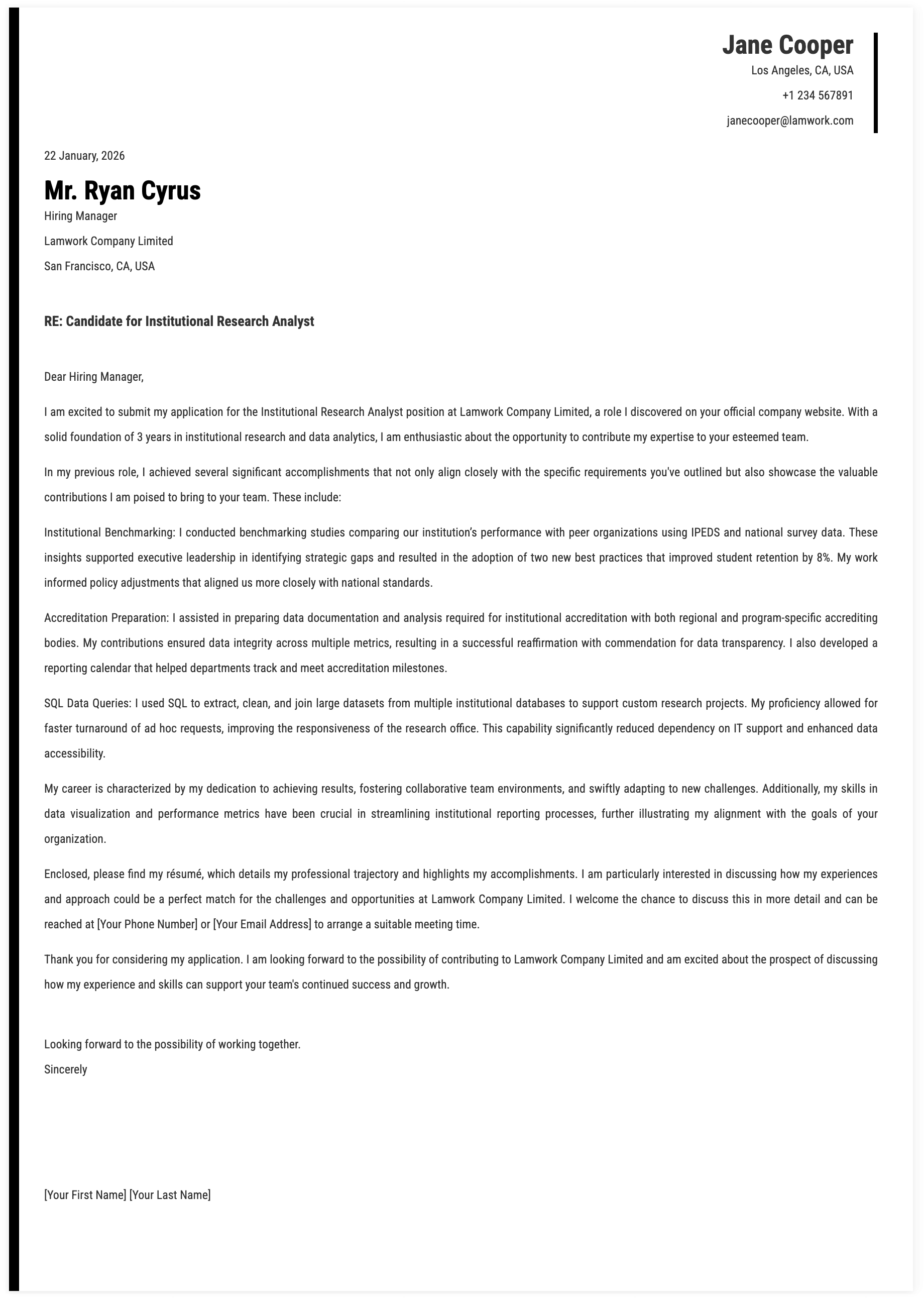 6. Outcomes for Institutional Research Analyst Cover Letter