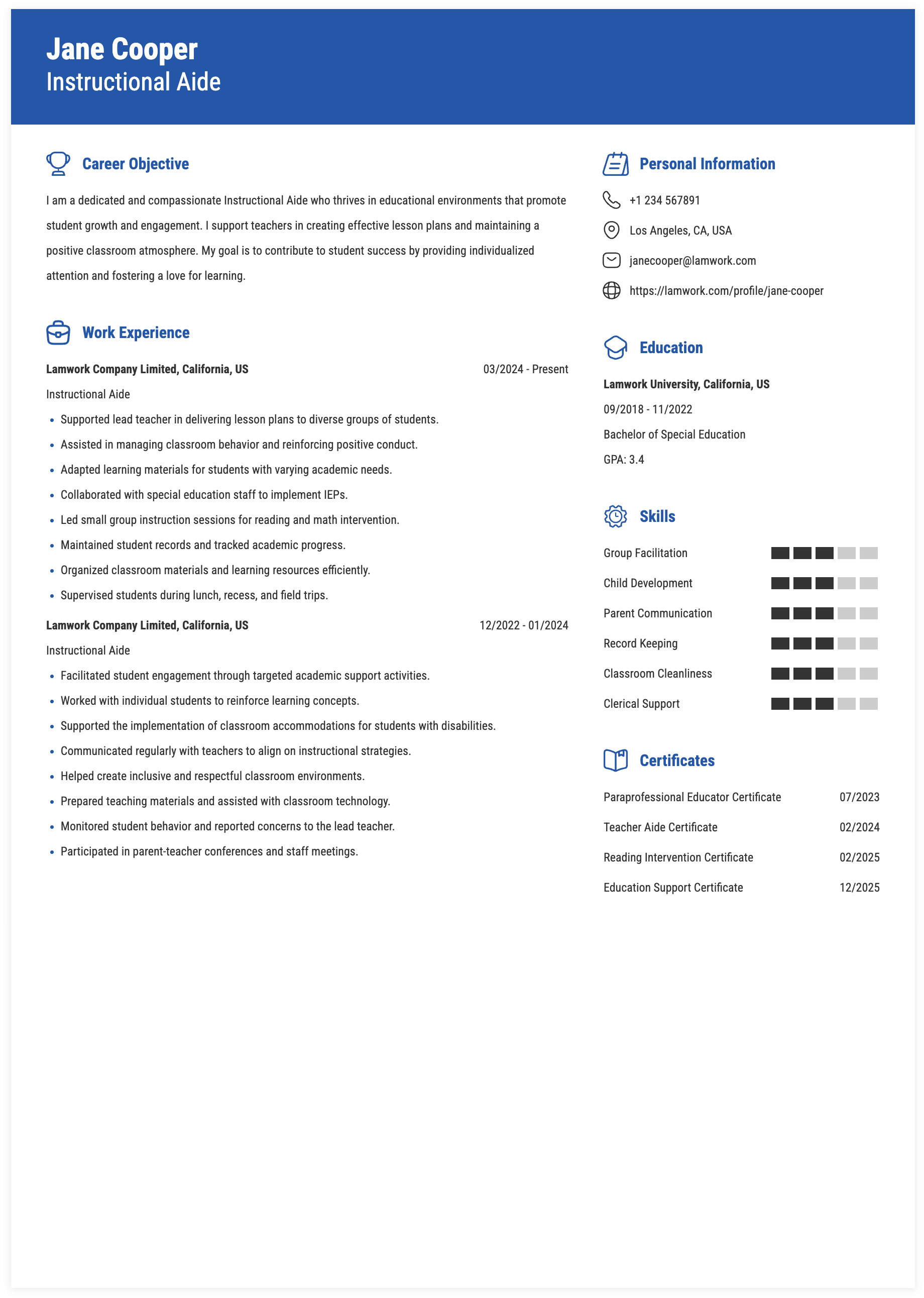 INSTRUCTIONAL AIDE RESUME EXAMPLE