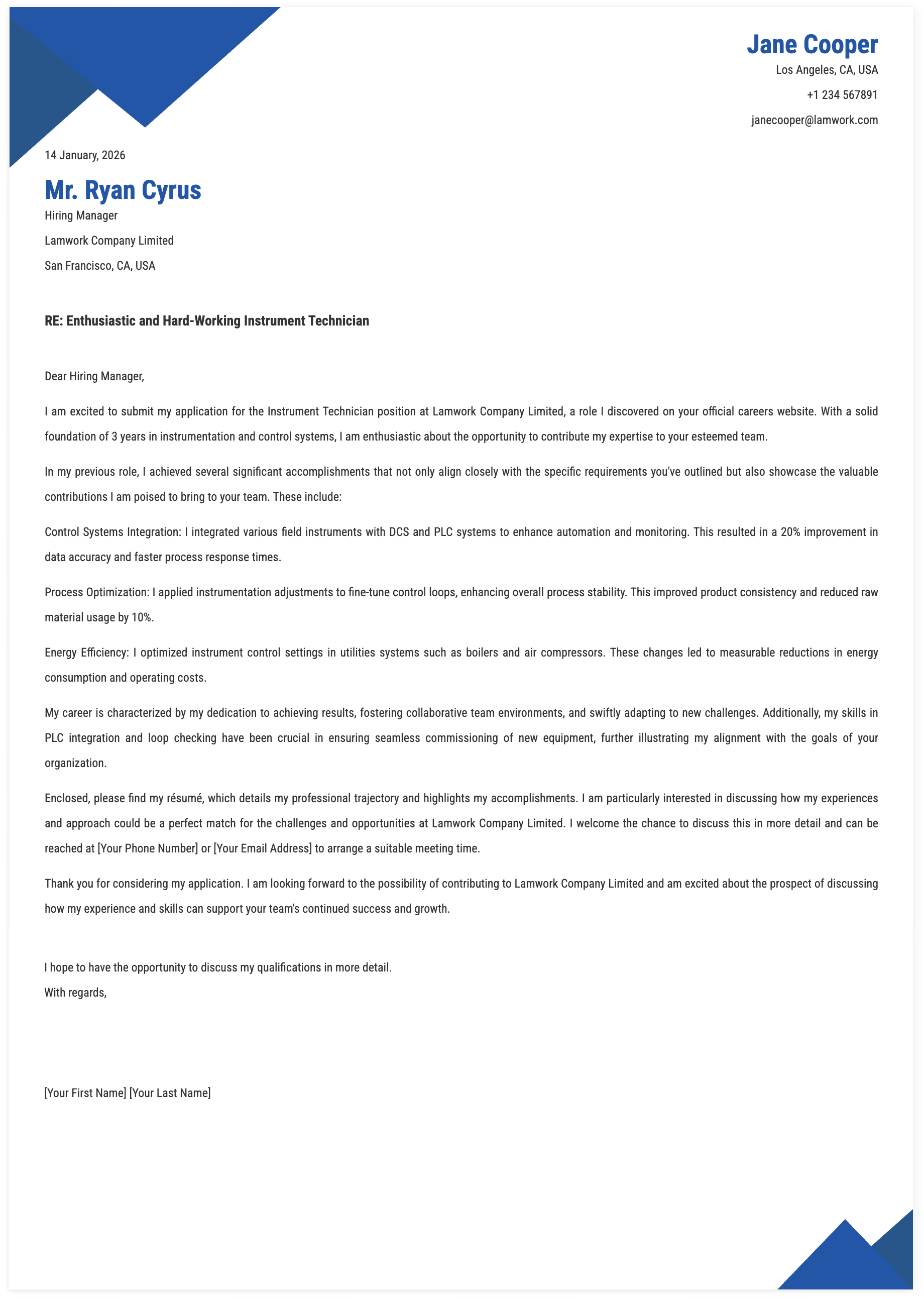 1. Details for Instrument Technician Cover Letter