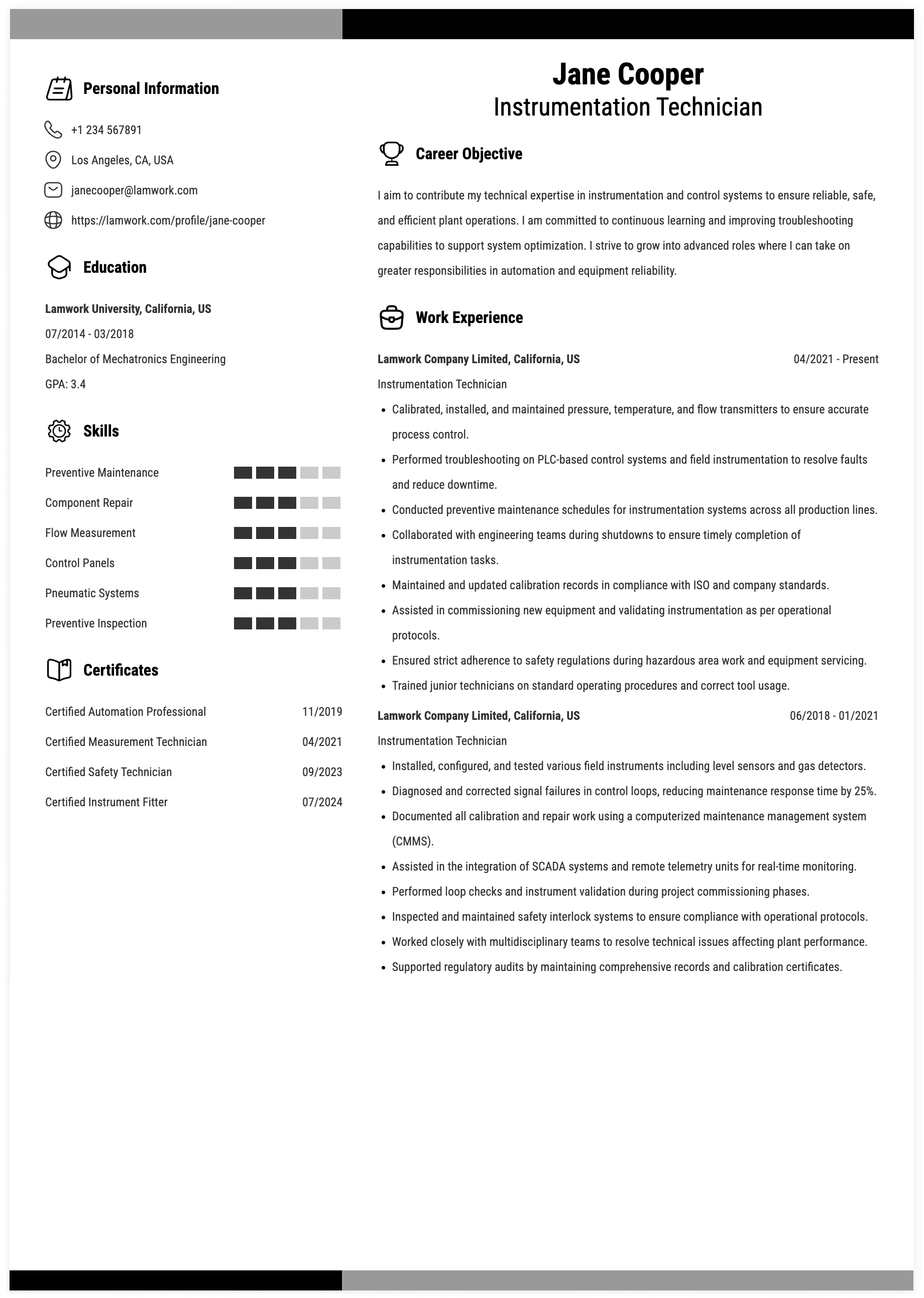 INSTRUMENTATION TECHNICIAN RESUME EXAMPLE