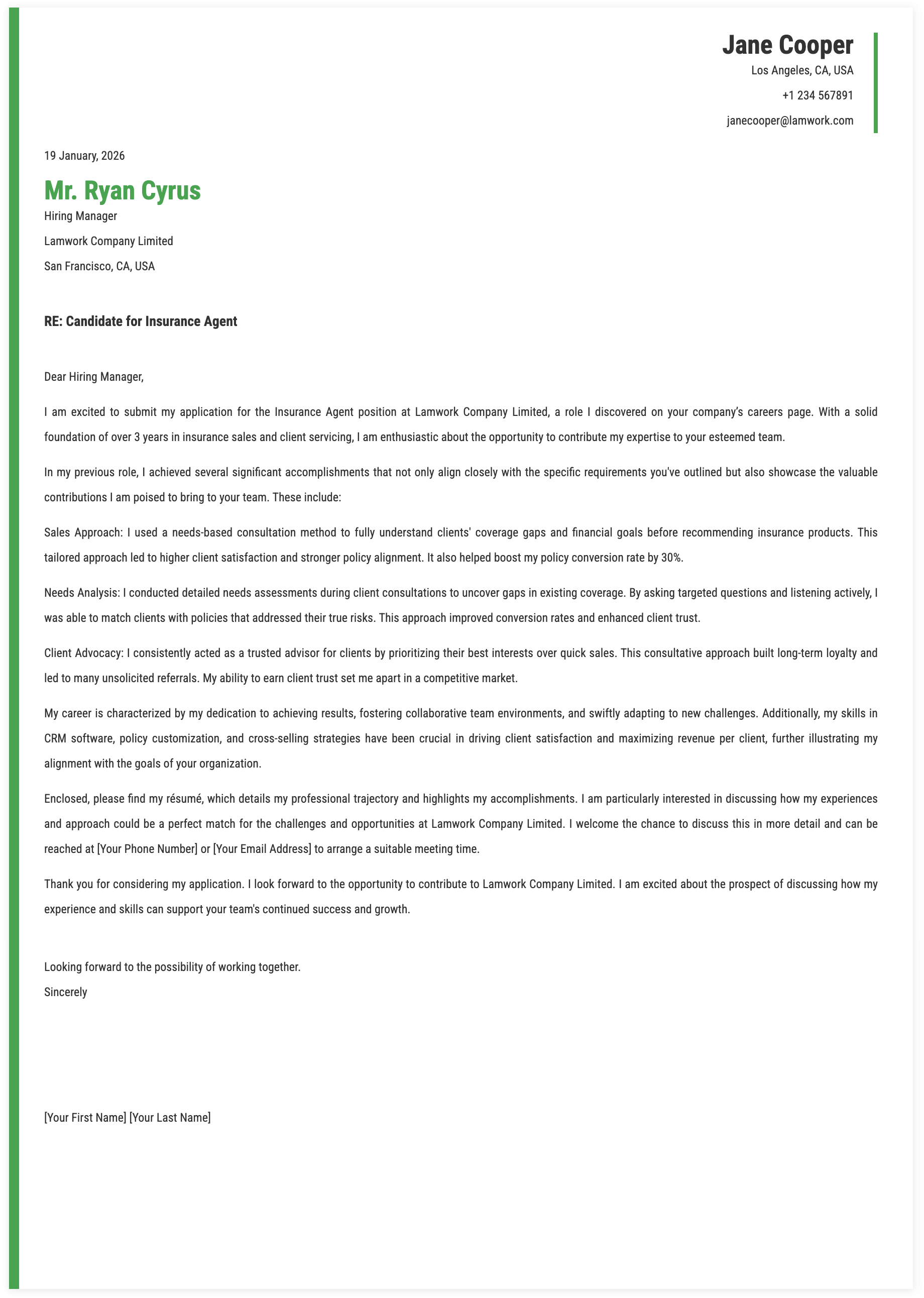 What are the Qualifications and Requirements for Insurance Agent in a Cover Letter?