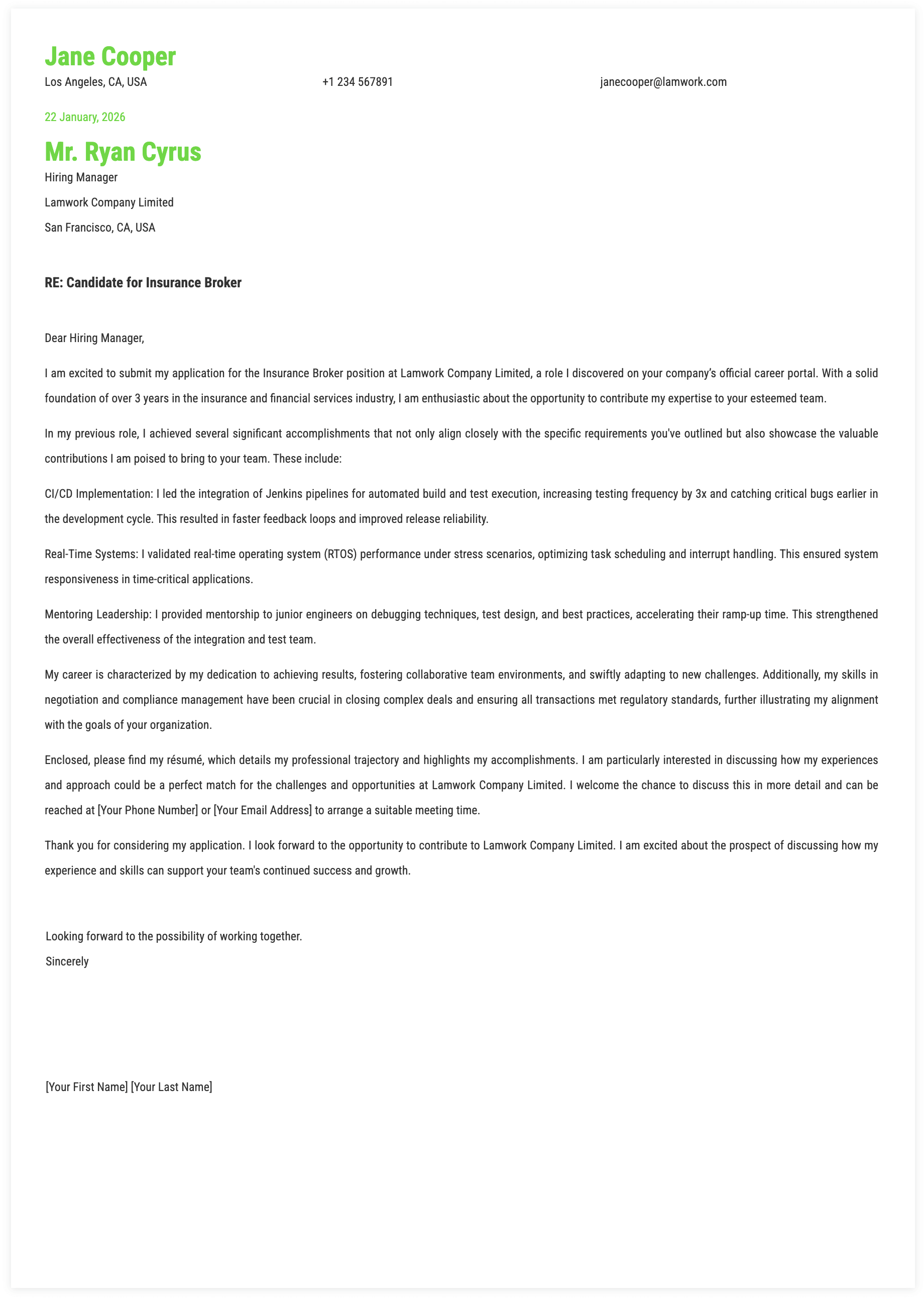 1. Details for Insurance Broker Cover Letter