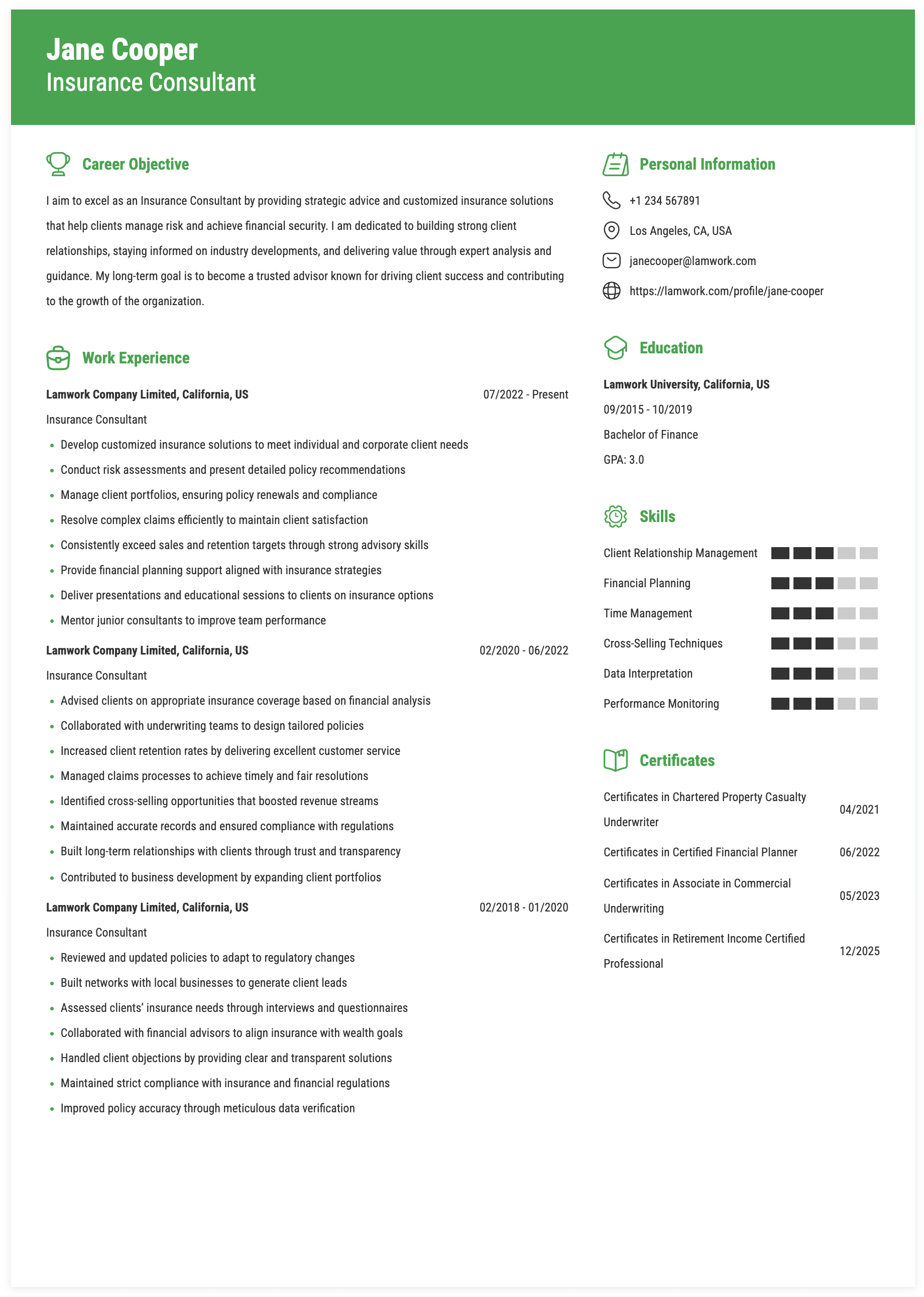 20. Insurance Consultant, Evergreen Insurance Solutions, Tacoma, WA