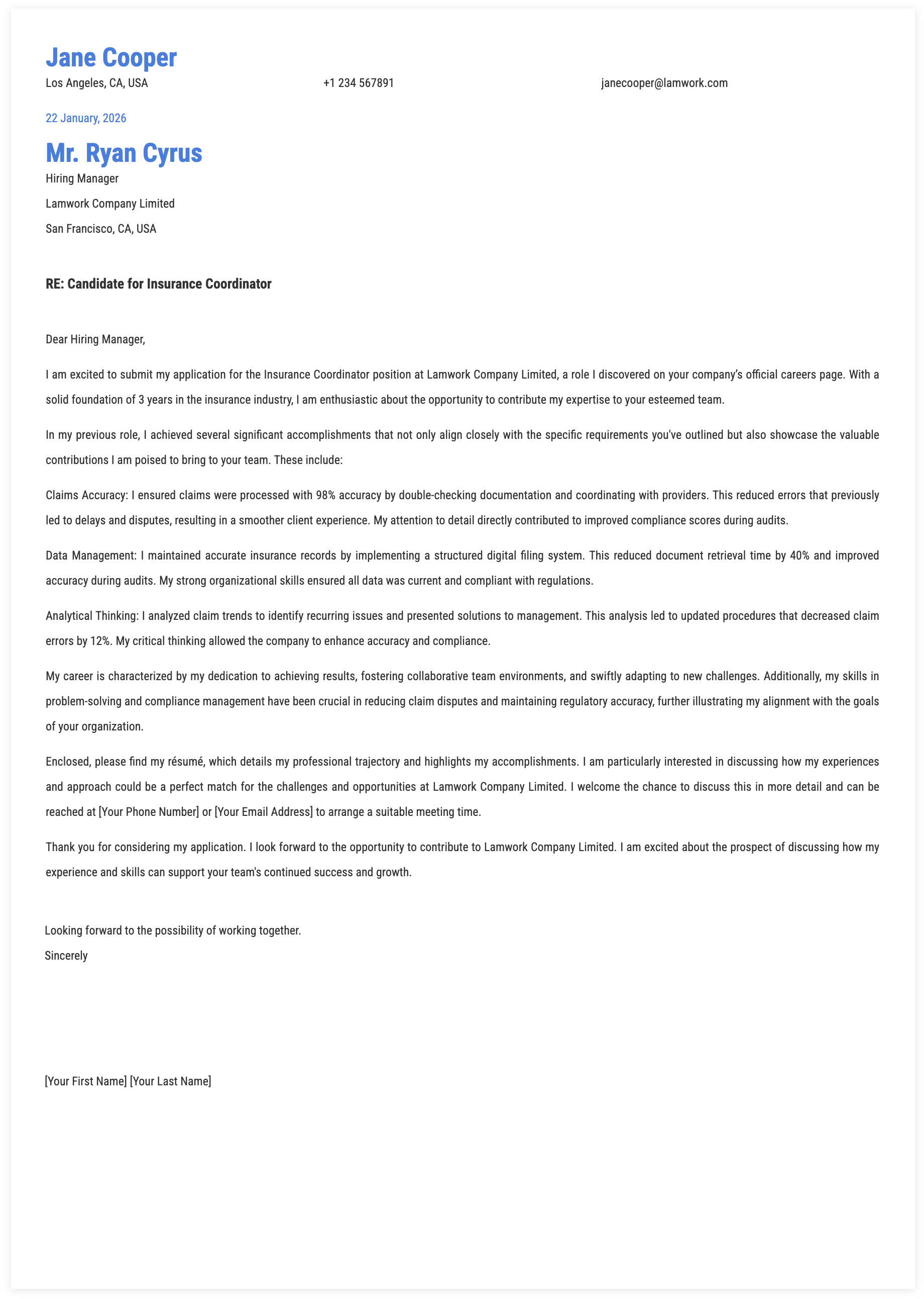 What are the Qualifications and Requirements for Insurance Coordinator in a Cover Letter?