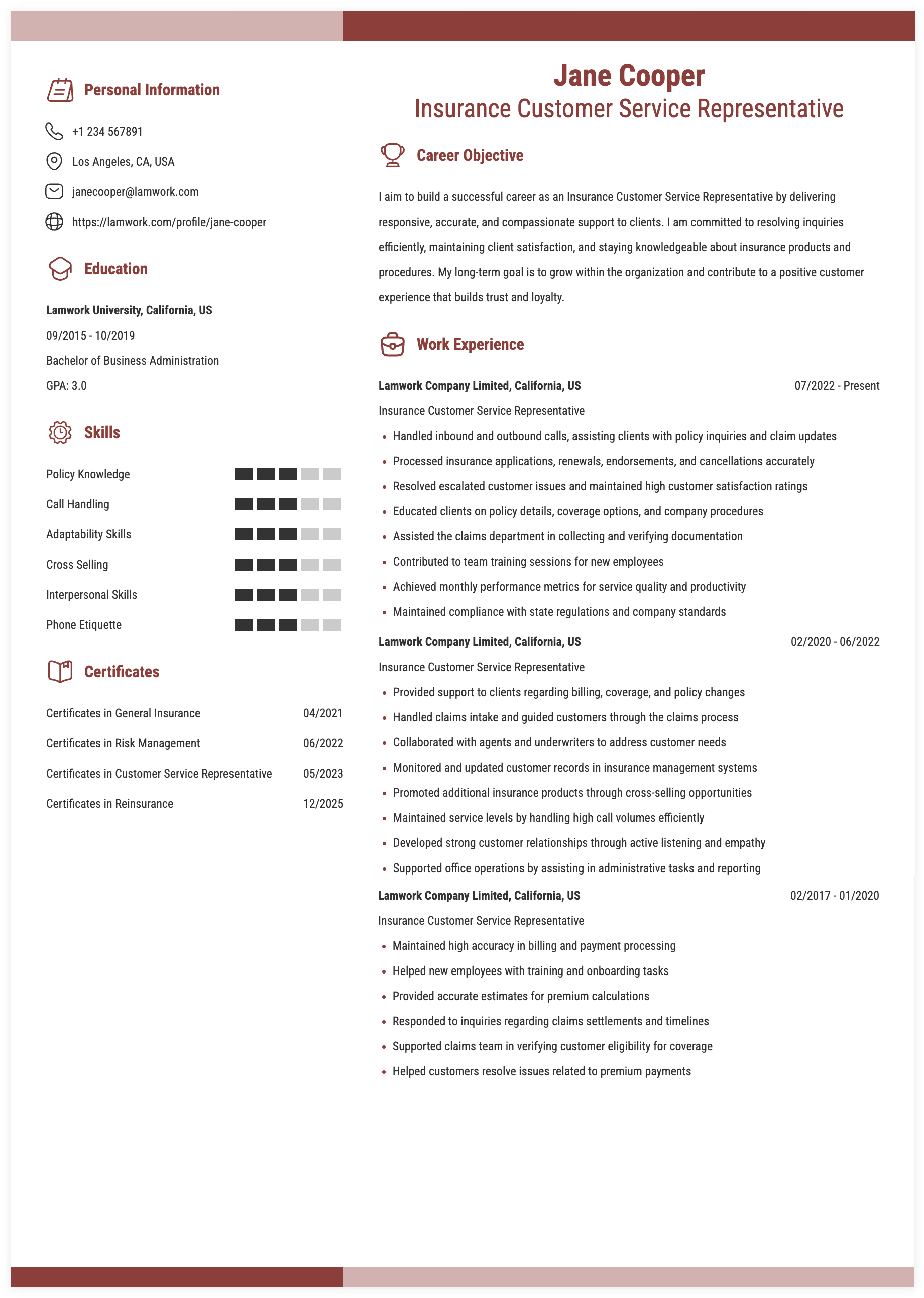 9. Insurance Customer Service Representative, Redwood Insurance Solutions, Santa Rosa, CA
