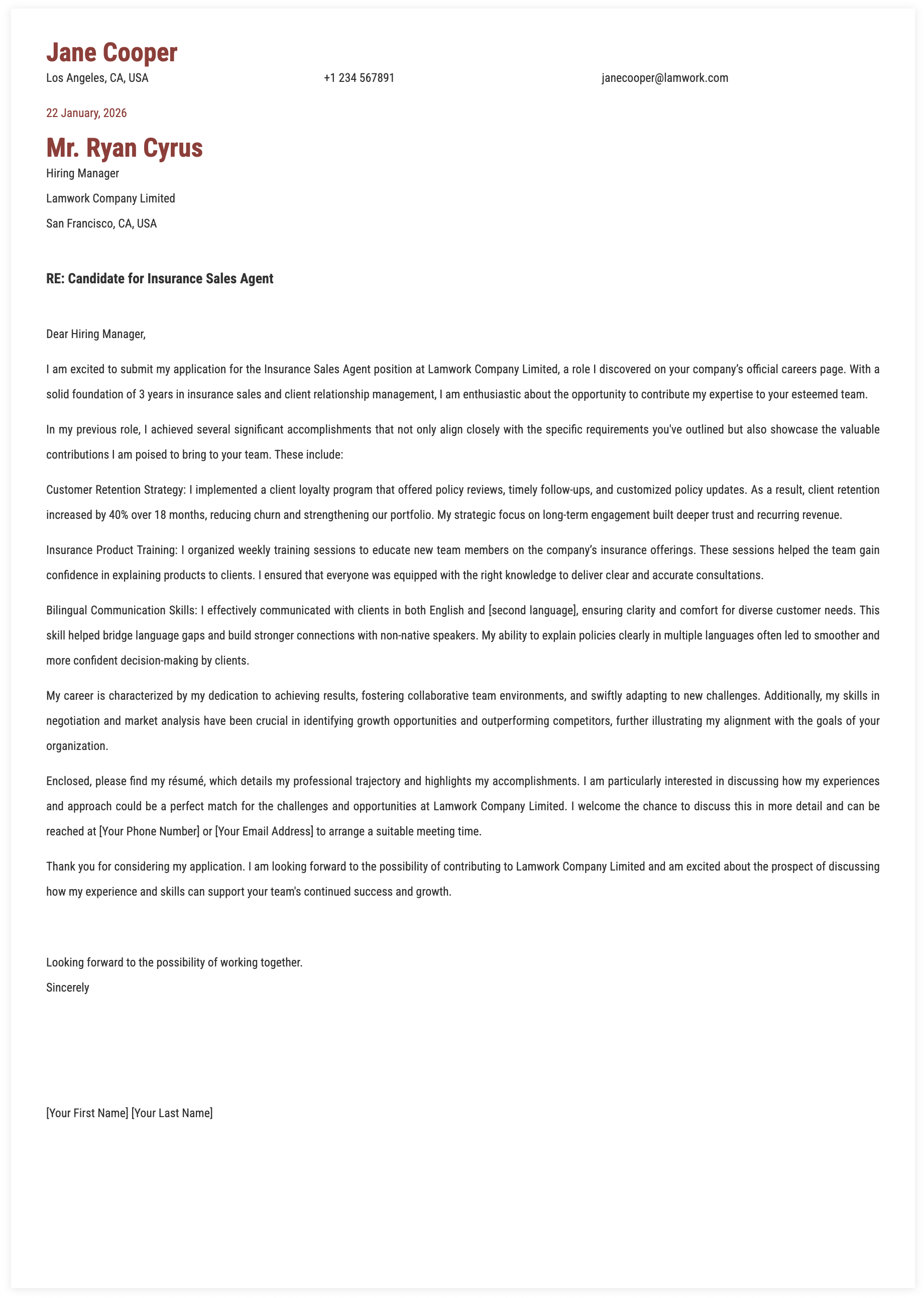 8. Job Description for Insurance Sales Agent Cover Letter