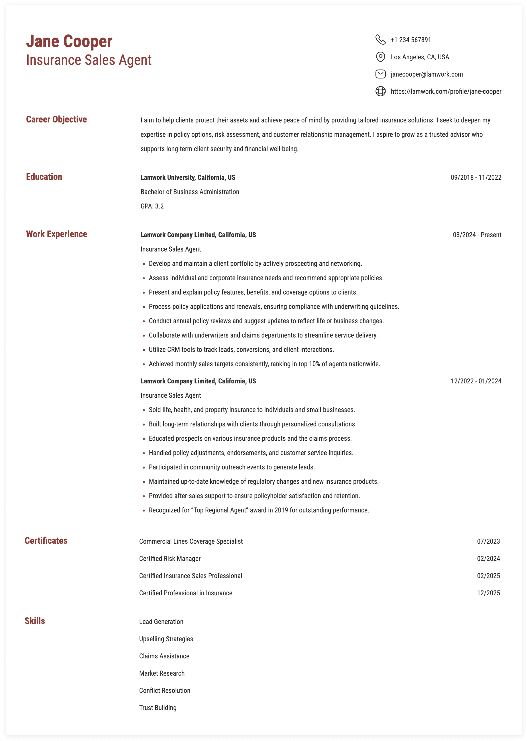 14. Insurance Sales Agent, Pacific Risk Solutions, Portland, OR