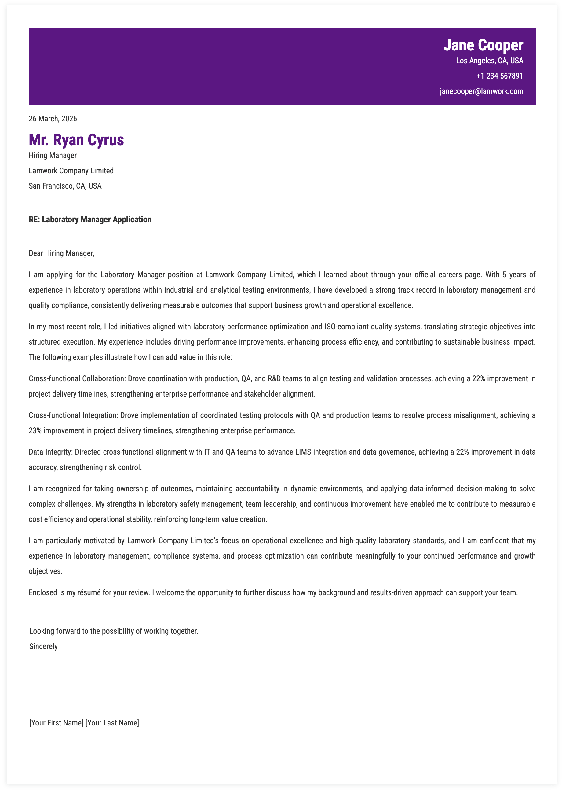 I am prepared to contribute to Lamwork Company Limited by strengthening operational performance, enhancing testing reliability, and supporting continuous improvement initiatives. I look forward to delivering consistent and measurable results within your laboratory operations.