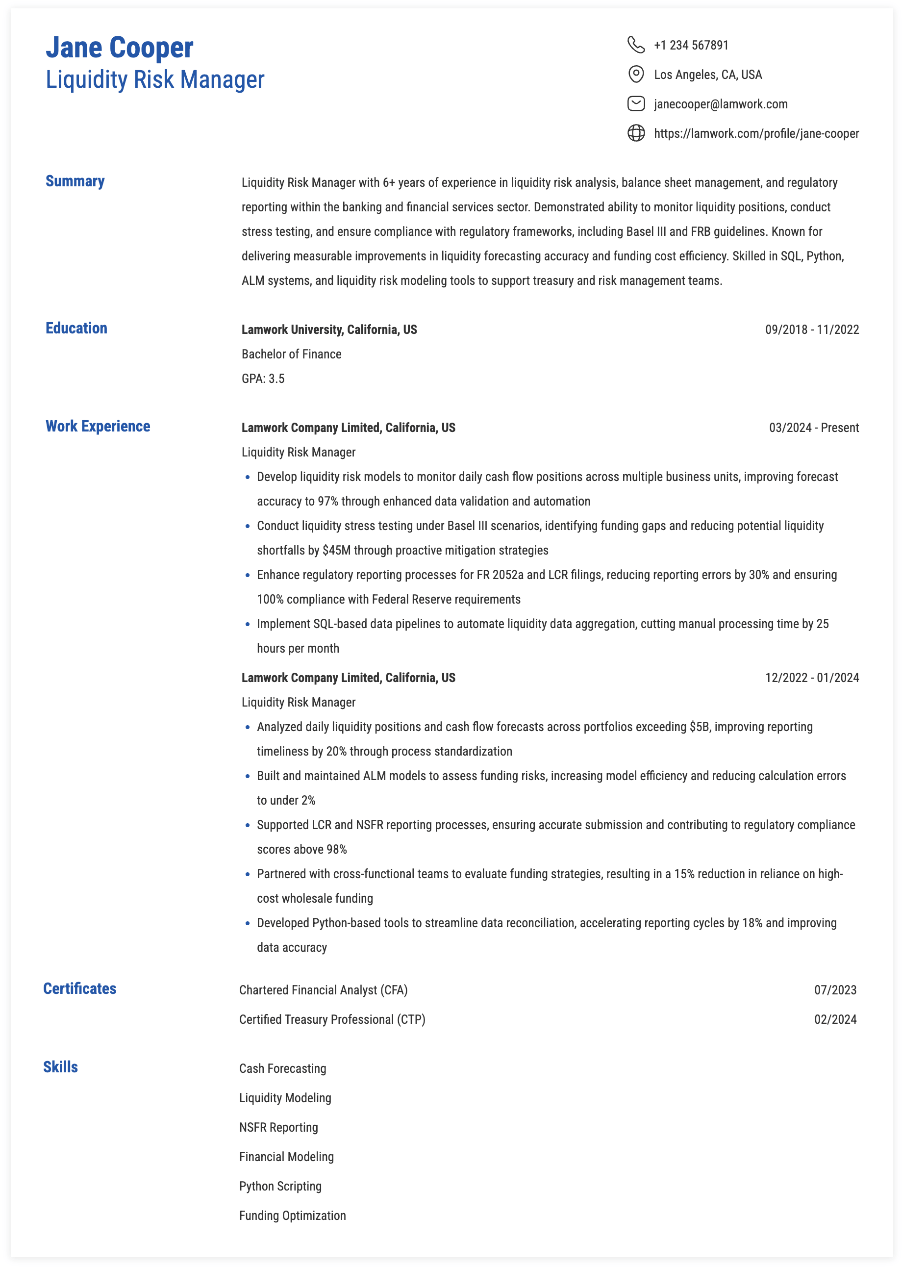 Sample ATS-Friendly Work Experience for Liquidity Risk Manager Roles