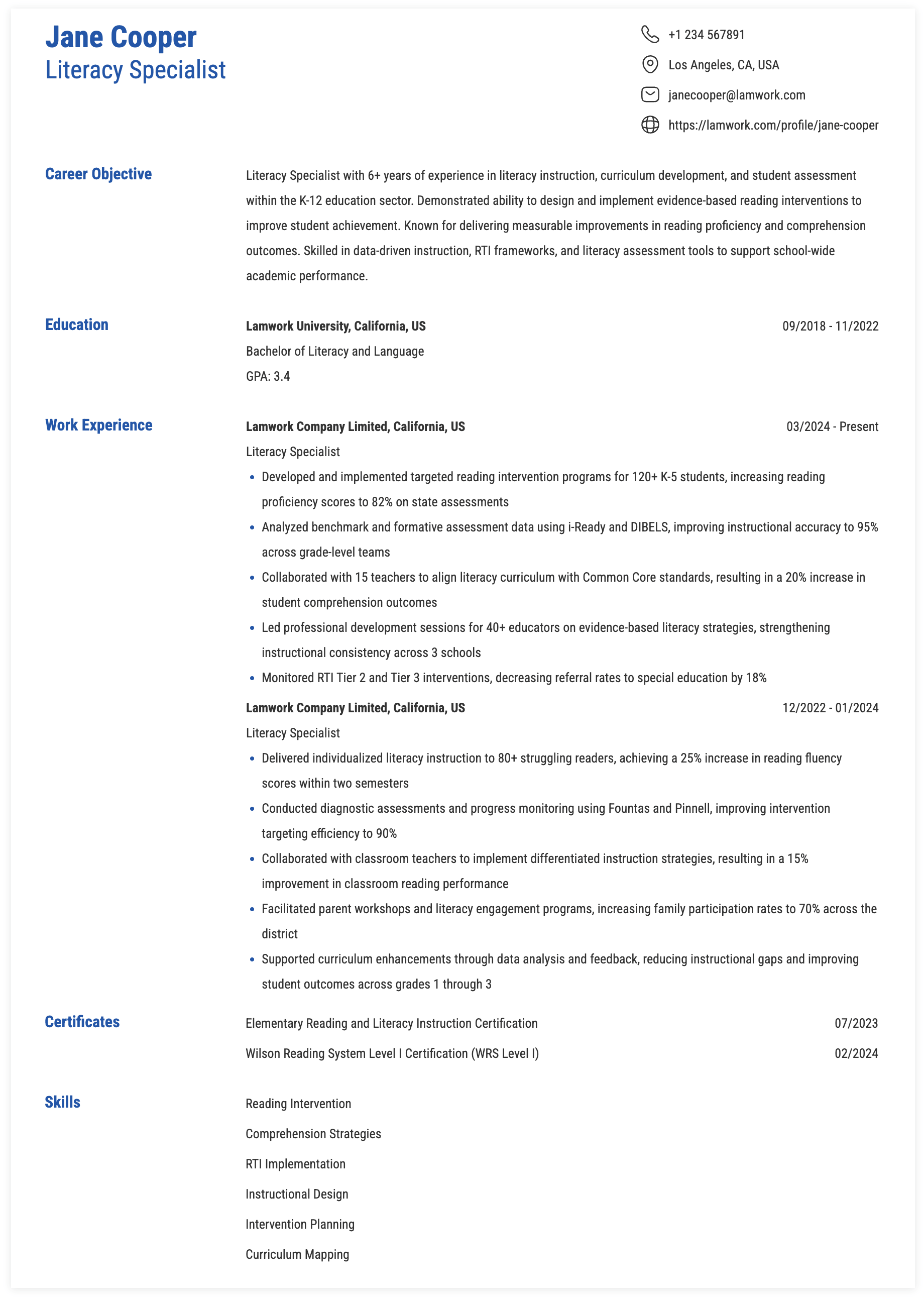 Sample ATS-Friendly Work Experience for Literacy Specialist Roles