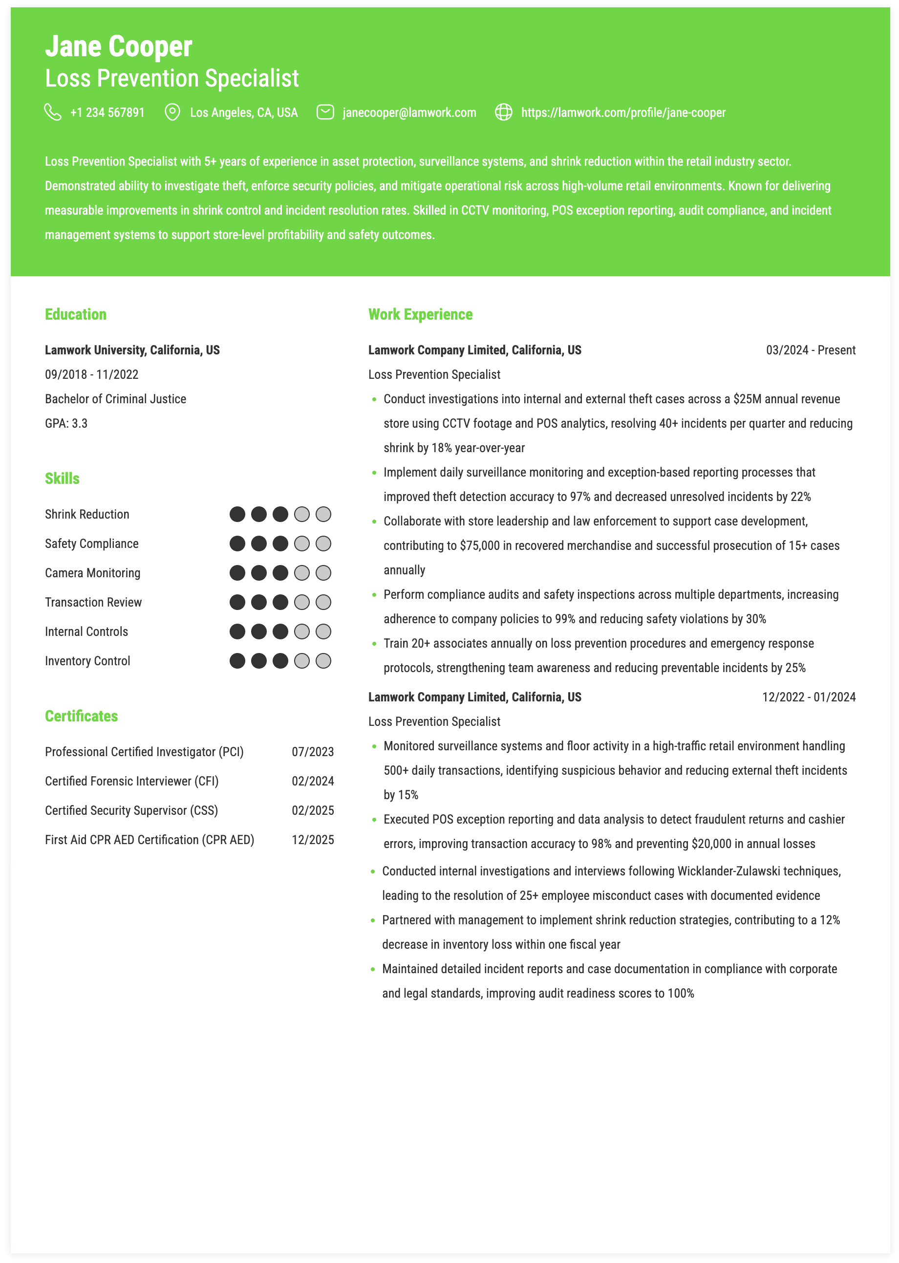 Results-driven Loss Prevention Specialist with 5+ years of experience in asset protection, fraud investigation, and CCTV analytics within multi-location retail environments. Proven record of achieving a 27% reduction in shrinkage through data-driven investigations and improved security controls. Expertise in incident investigation and risk analysis to optimize operational security processes, mitigate financial losses, and drive measurable business outcomes across high-volume retail operations.