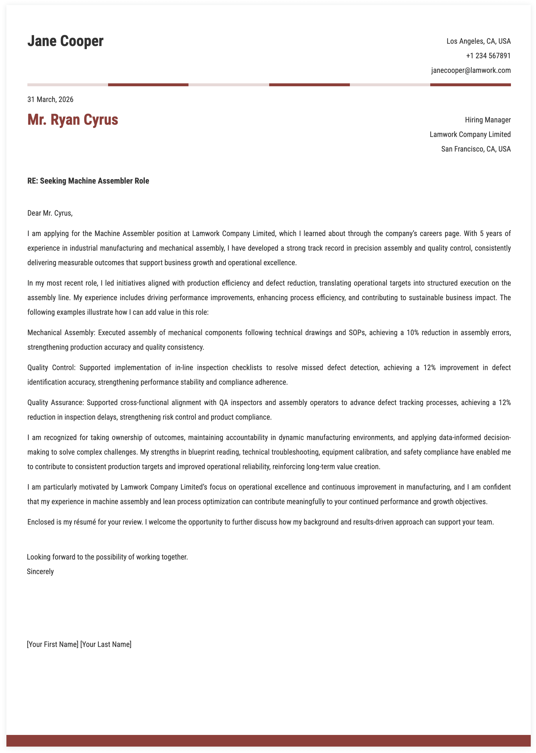I am submitting my application for the Machine Assembler position, as advertised through Indeed. With 1 year of experience in Mechanical Assembly and Manufacturing Operations, I have developed strong expertise in blueprint reading and precision measurement, consistently delivering measurable, business-aligned results that support strategic and operational objectives.