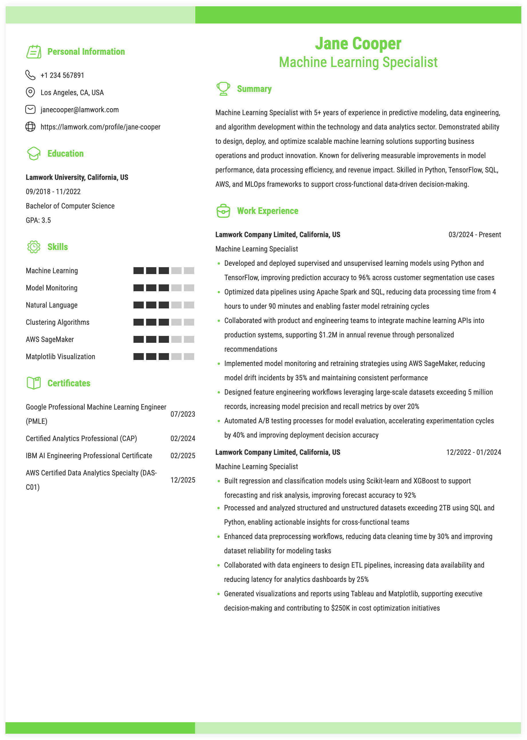 2. Mid-Level Machine Learning Specialist Resume