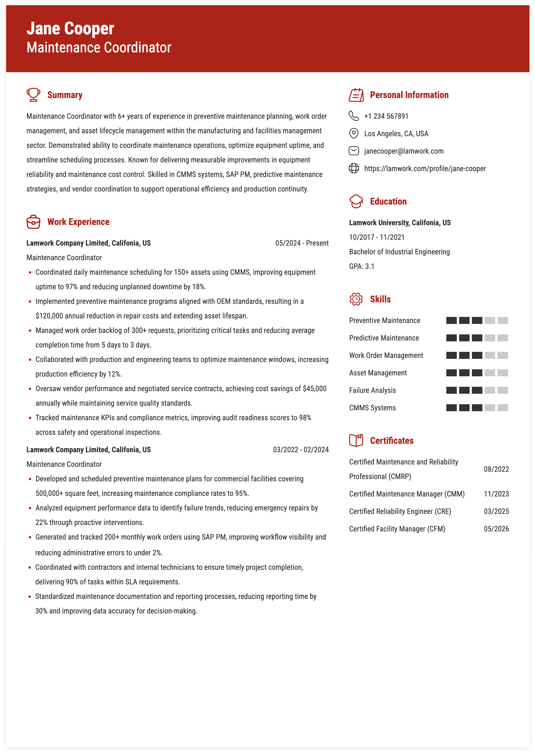 Results-driven Maintenance Coordinator with 5+ years of experience in maintenance scheduling, CMMS administration, and asset reliability within manufacturing environments. Proven record of reducing downtime by 20% through optimized planning and coordination. Expertise in preventive maintenance and inventory management to optimize equipment performance, mitigate operational risks, and drive efficiency.