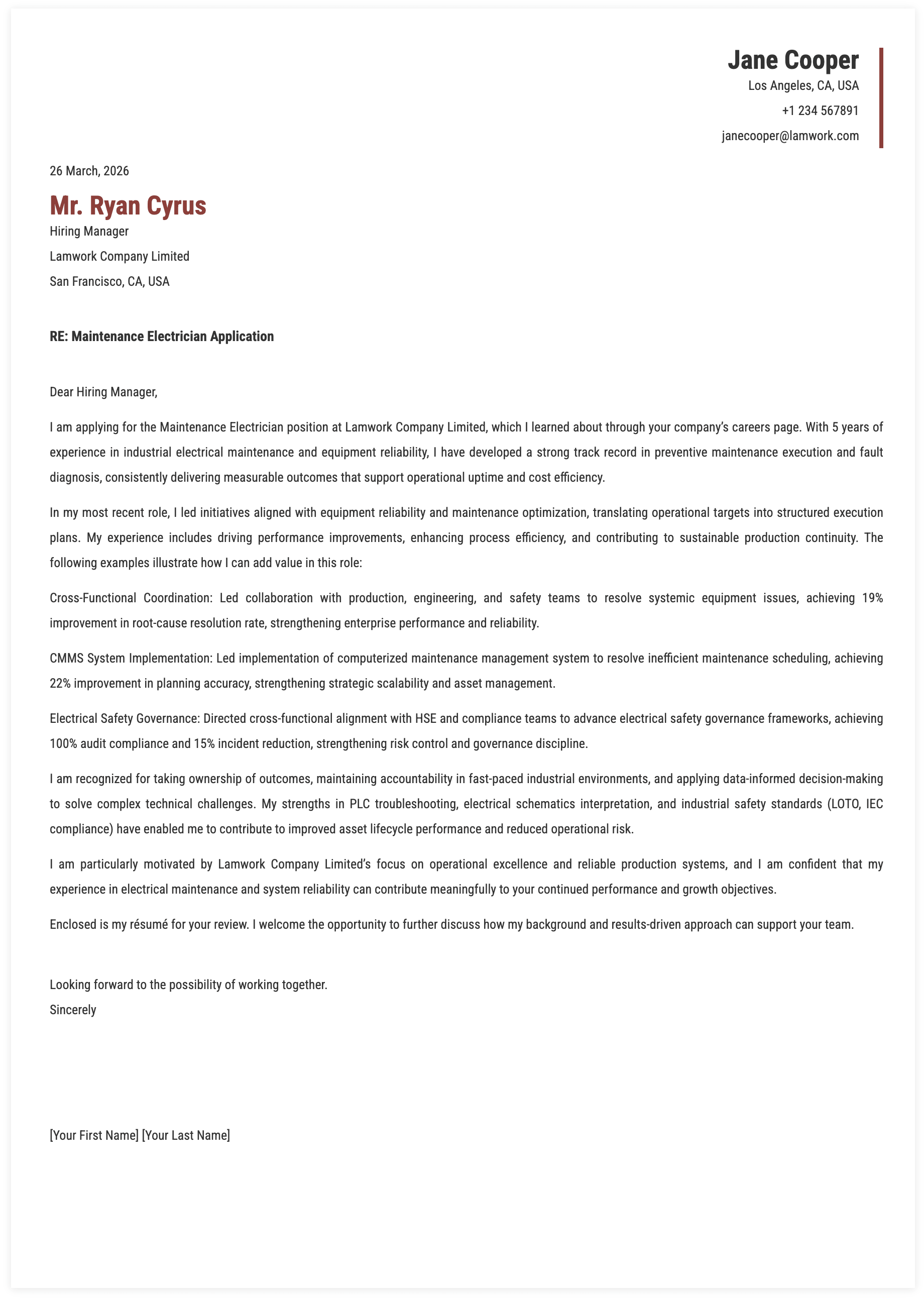 Maintenance Electrician Cover Letter Examples by Experience Level