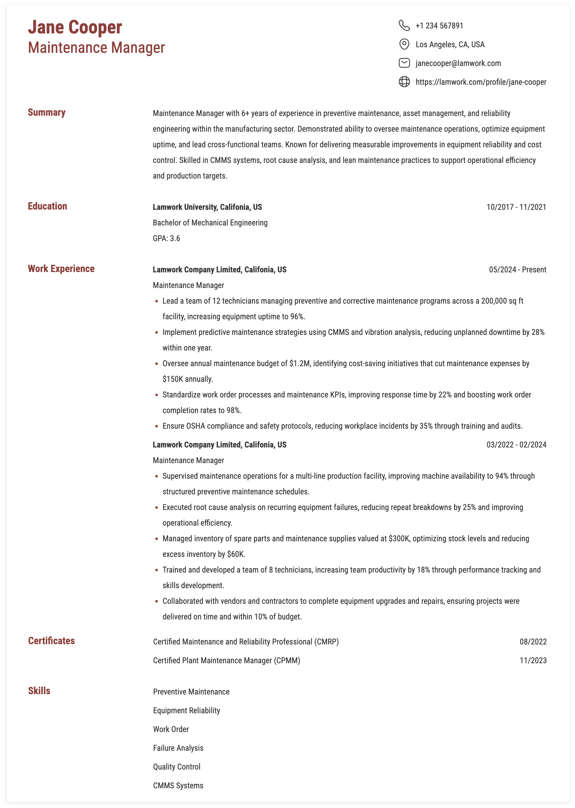 Published: Mar 25, 2026. The Maintenance Manager oversees preventive and predictive maintenance programs, asset reliability, and facility operations to ensure equipment uptime, safety compliance, and cost efficiency. This role leads maintenance teams, manages budgets, coordinates contractors, and drives continuous improvement using CMMS, root cause analysis, and reliability engineering practices. The Manager also delivers measurable business impact by reducing downtime, optimizing operational performance, and ensuring compliance with regulatory, safety, and quality standards across industrial and manufacturing environments.