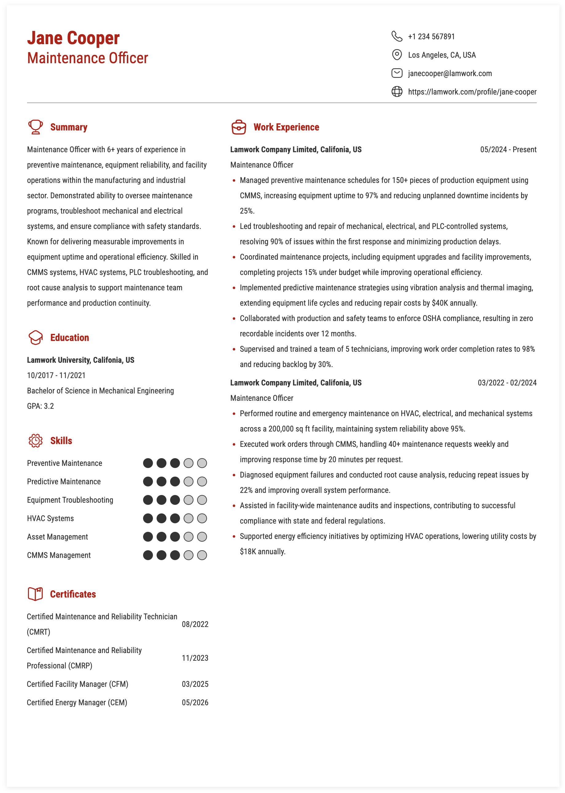 Sample ATS-Friendly Work Experience for Maintenance Officer Roles