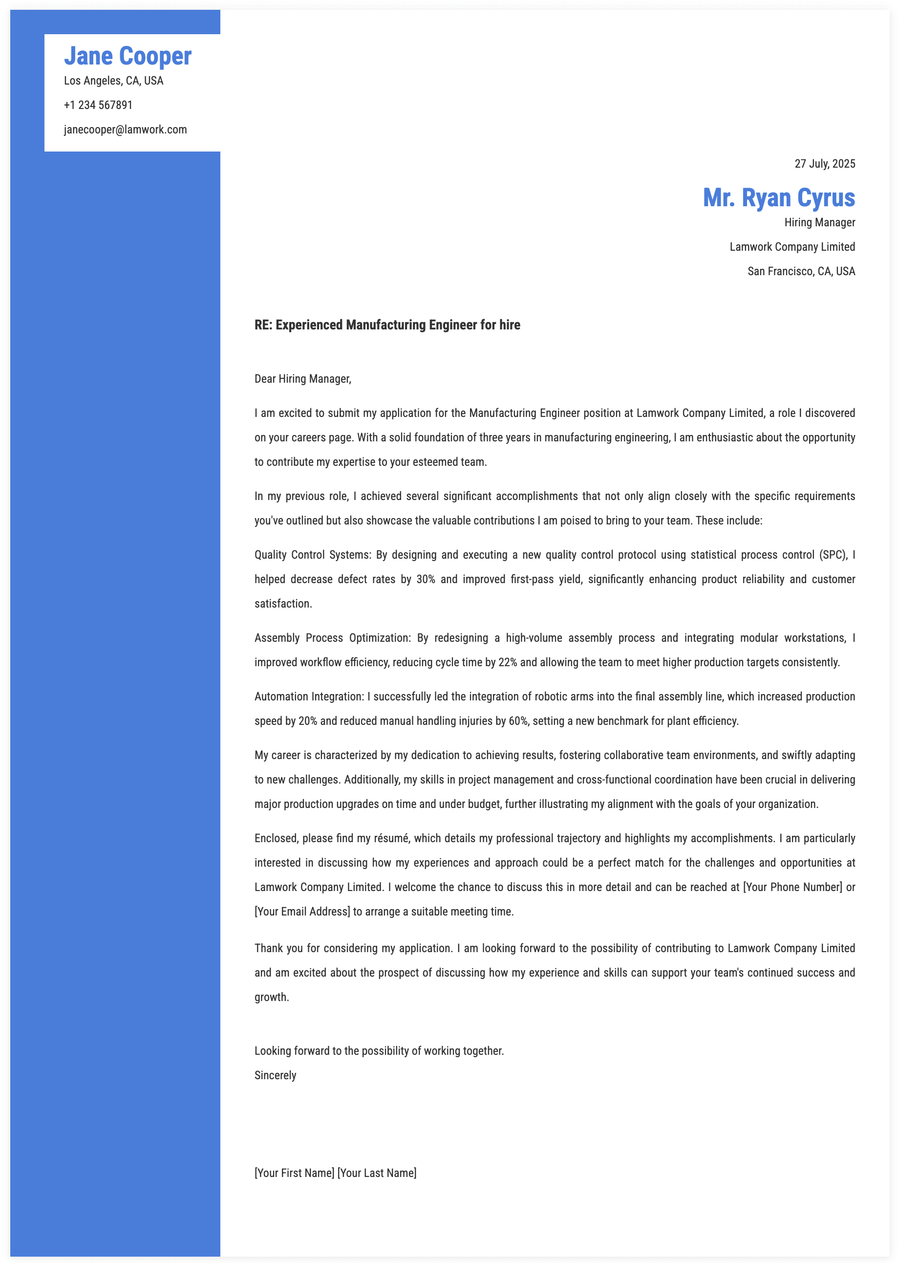 19. Key Achievements for Manufacturing Engineer Cover Letter