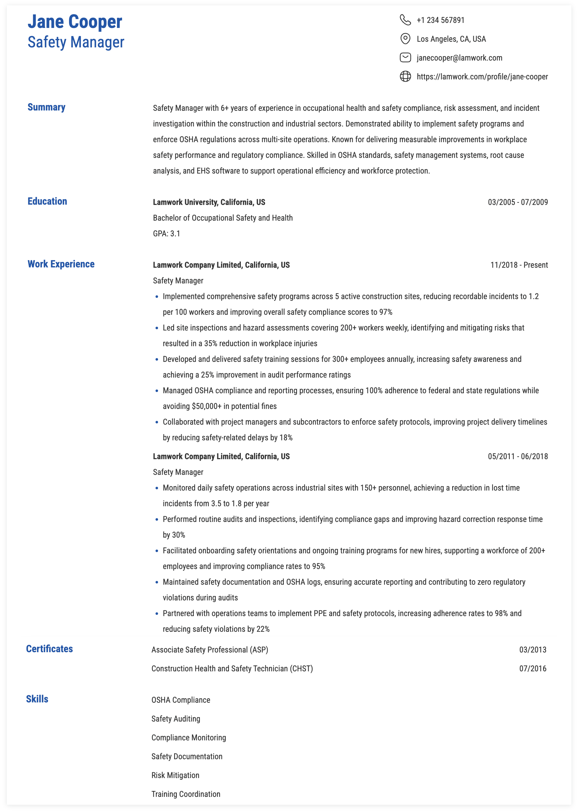 SAFETY MANAGER RESUME EXAMPLE