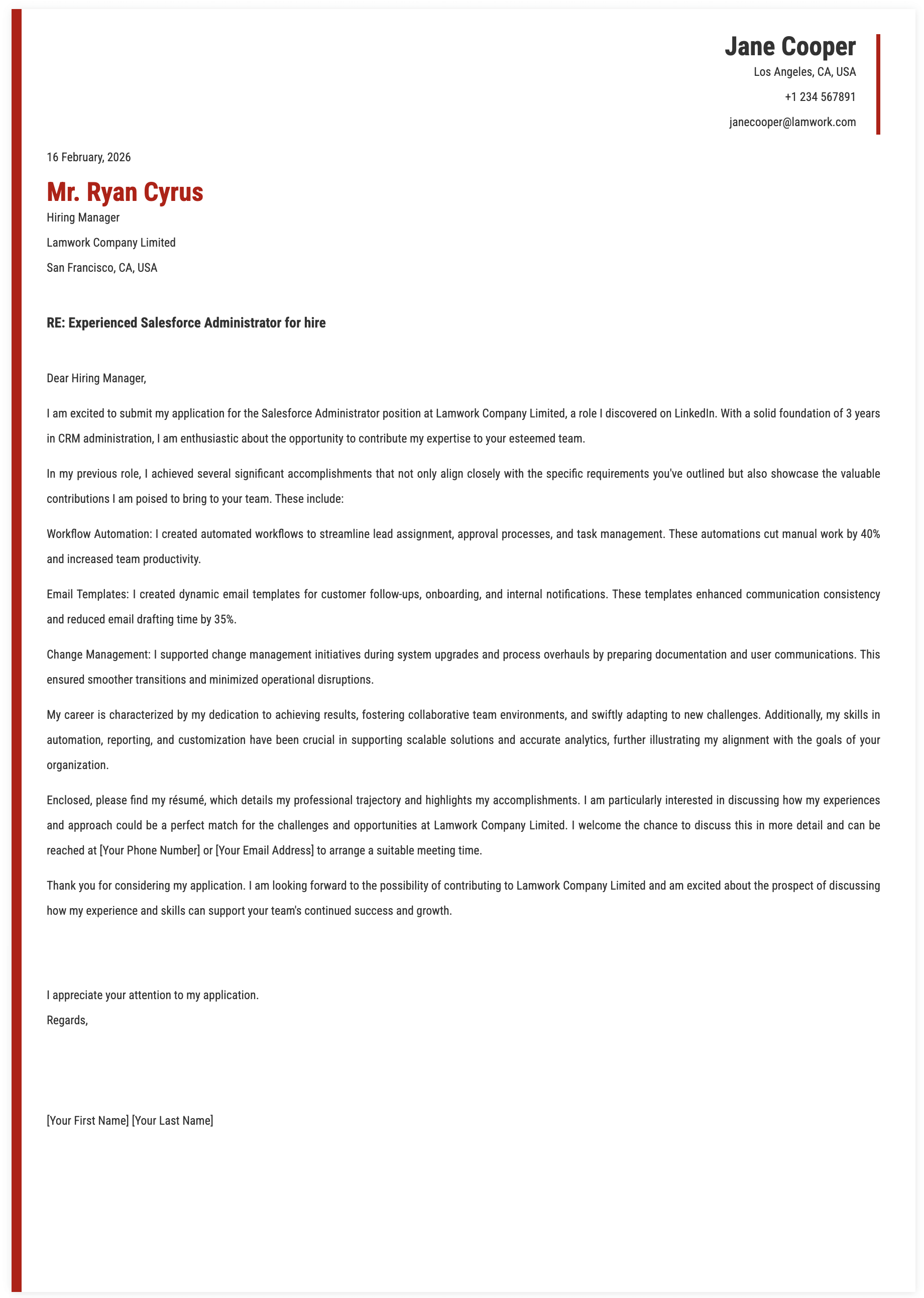 I am applying for the Salesforce Administrator position at Lamwork Company Limited, which I learned about through Glassdoor. With 12 years of experience in Salesforce CRM strategy and enterprise system governance, I have driven large-scale automation and integration initiatives that increased revenue process efficiency by 34% across multi-department operations.