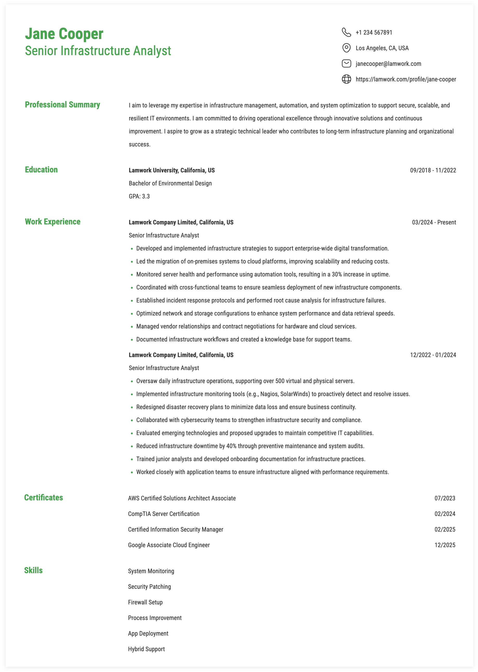 SENIOR INFRASTRUCTURE ANALYST RESUME EXAMPLE