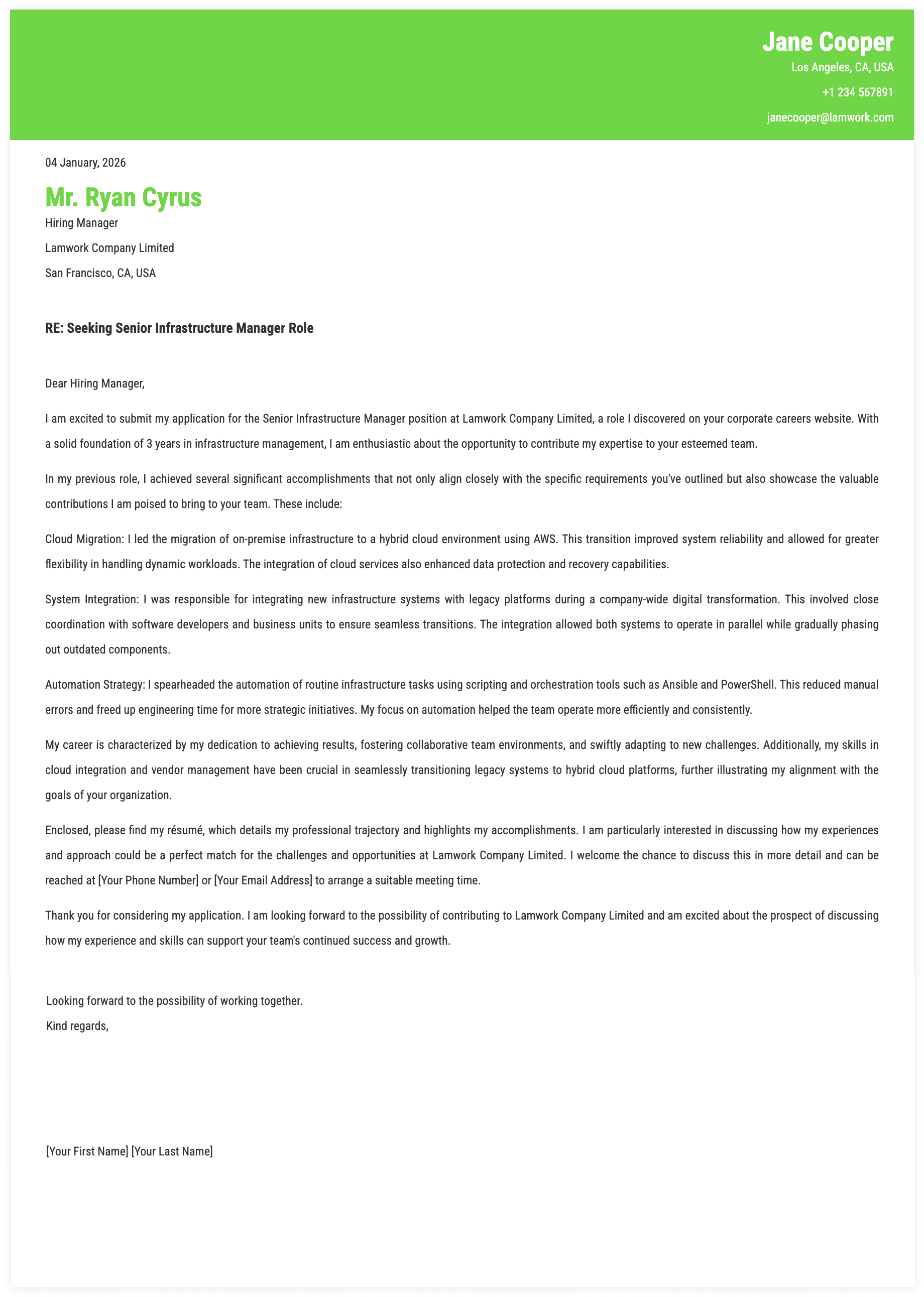 1. Outcomes for Senior Infrastructure Manager Cover Letter