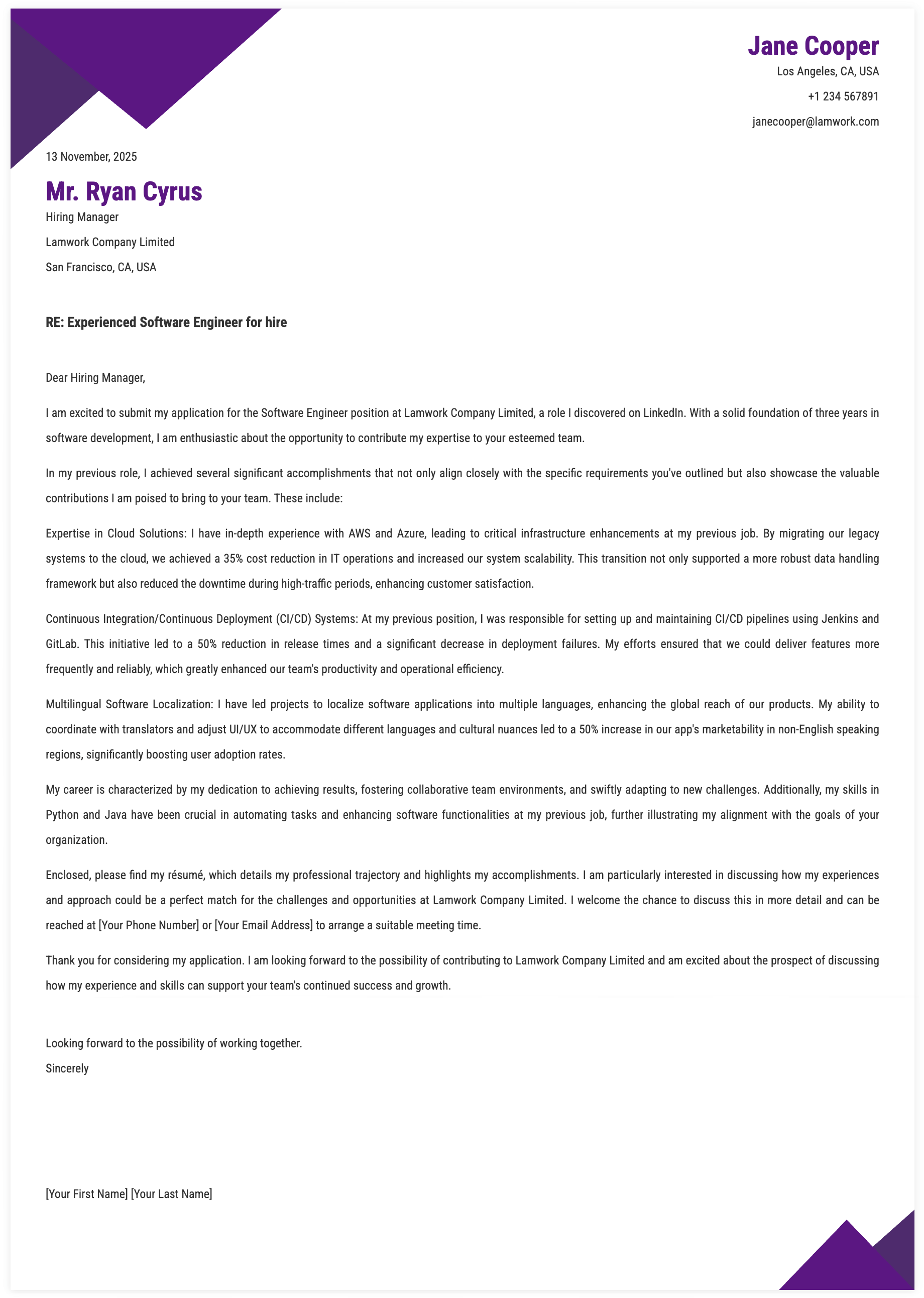 3. Achievement Highlights for Software Engineer Cover Letter